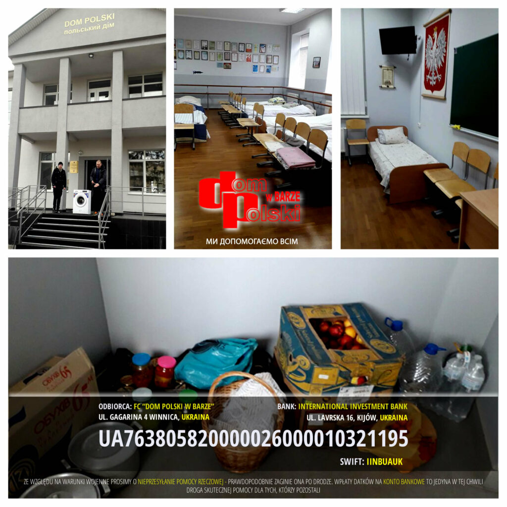 Zachęcamy Was do pilnego wsparcia finansowego działalności Domu Polskiego w Barze. Jednocześnie apelujemy o nie przesyłanie darów w postaci pomocy rzeczowej – ze względu na warunki wojenne jest ona niszczona albo ginie po drodze. Prosimy również o kontakt w przypadku trudności z dokonaniem przelewu zagranicznego do Ukrainy.
