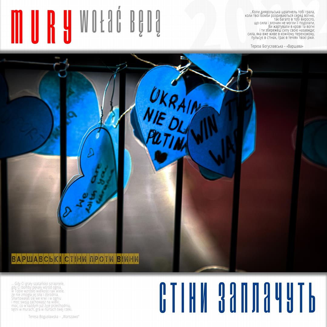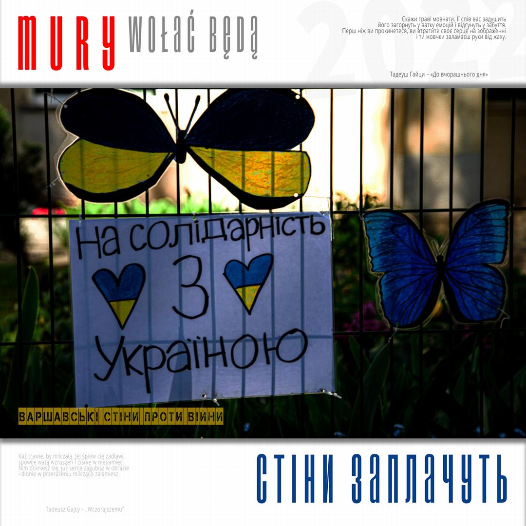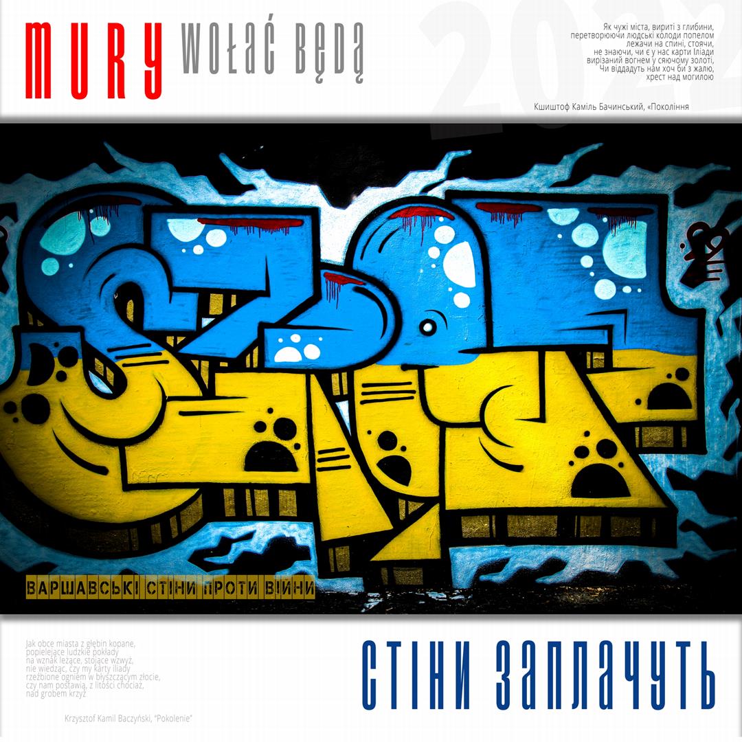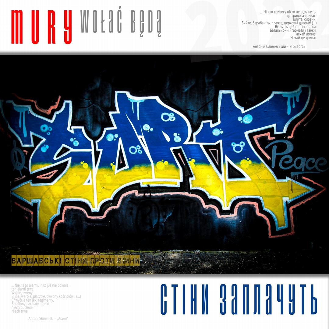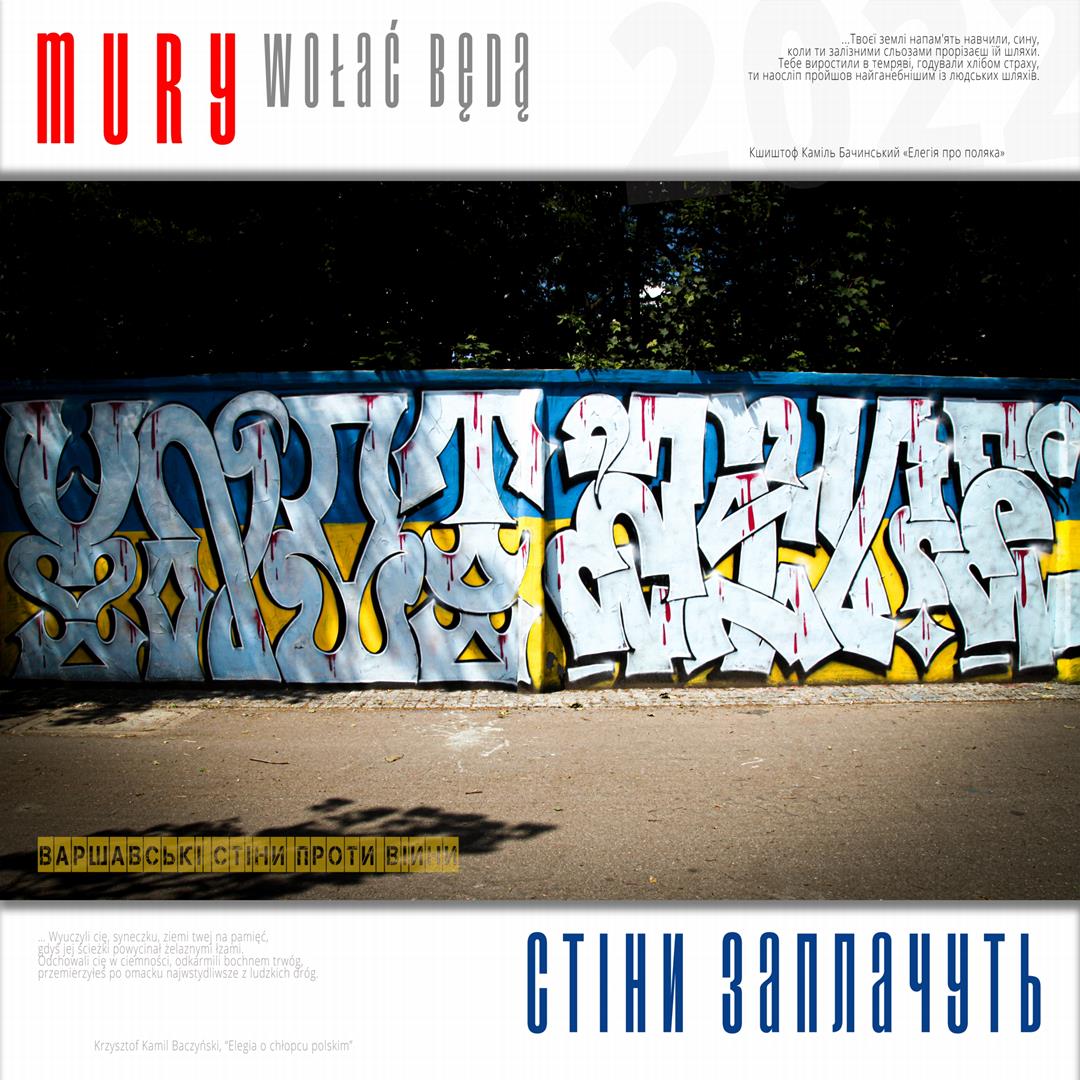 Warto naszym zdaniem zaznaczyć, iż zdaniem realizatorów projektu istnieje w jego treści bezpośrednie nawiązanie do wydarzeń znanych z historii Polski, w szczególności zaś do historii naszego miasta w okresie okupacji niemieckiej. Ukraińskie miasta w czasie walki z rosyjskim najeźdźcą przypominają do złudzenia Warszawę lat czterdziestych – niezłomną, szydzącą z wroga, przeciwstawiającą brutalnej sile uliczną kpinę i absolutnie nieprzyjmującą do wiadomości żądań poddania się nieprzyjacielowi, drwiącą z niego napisami na murach i twórczością ulicznych artystów. Warszawa reagowała wówczas na działania niemieckich okupantów kotwicami na murach, hasłami i „zakazanymi piosenkami”, które w warszawskiej tradycji przetrwały do lat obecnych. Uważamy, iż ukazanie współczesnych warszawskich ulicznych grafik, haseł i niejednokrotnie dzieł o wysokiej wartości artystycznej w kontekście niezłomności współczesnych miast ukraińskich i oporu jego mieszkańców wobec działań wojennych i presji propagandy rosyjskiej (ale także w kontekście historii naszego miasta) może stanowić wartościowy element naszego wkładu w walkę Ukrainy o przetrwanie i zwycięstwo. Udokumentowanie masowego poparcia warszawiaków dla krzywdy naszych sąsiadów. Stąd właśnie wszystkie fotografie, jakie zamieściliśmy na naszej wystawie opatrzone są fragmentami polskiej poezji wojennej z lat 1939 – 1945, w tym w szczególności fragmentami wierszy opisujących wojenną codzienność Warszawy – poezji Krzysztofa Kamila Baczyńskiego, Tadeusza Gajcego, Władysława Broniewskiego, Marii Pawlikowskiej – Jasnorzewskiej, Juliusza Krzyżewskiego, Józefa Szczepańskiego, Jana Brzechwy, Wiktora Hulewicza i innych autorów opisujących Warszawę lat wojny i oporu. Wszystkie fragmenty wierszy zawartych w treści wystawy przetłumaczone zostały również na język ukraiński.