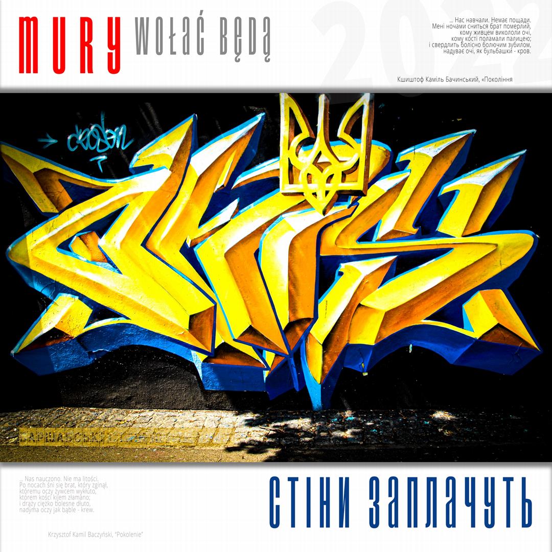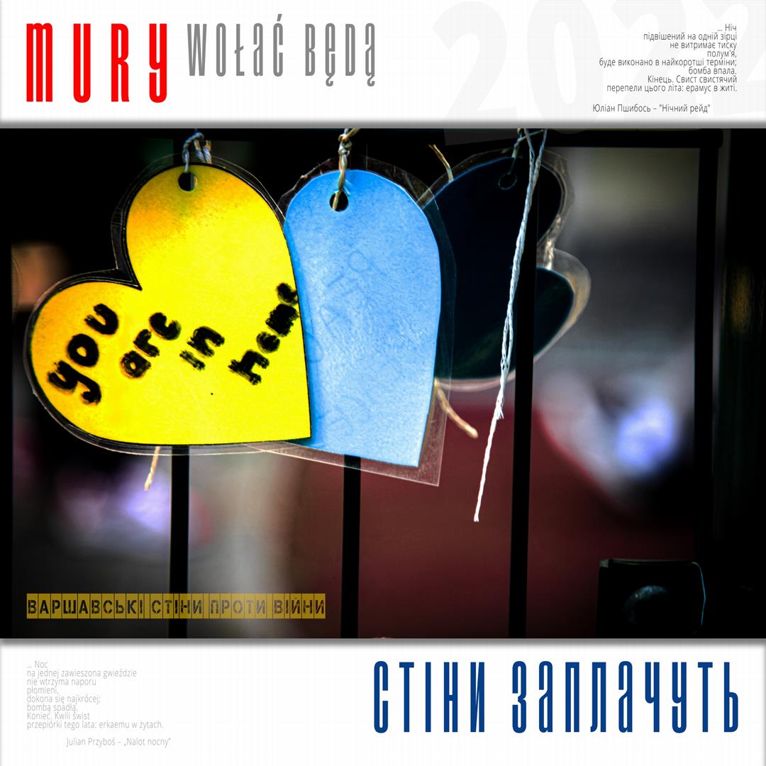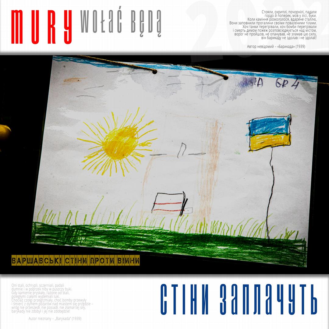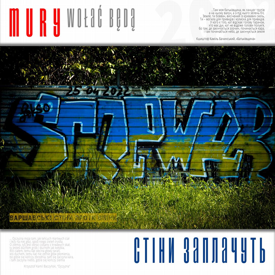 Warto naszym zdaniem zaznaczyć, iż zdaniem realizatorów projektu istnieje w jego treści bezpośrednie nawiązanie do wydarzeń znanych z historii Polski, w szczególności zaś do historii naszego miasta w okresie okupacji niemieckiej. Ukraińskie miasta w czasie walki z rosyjskim najeźdźcą przypominają do złudzenia Warszawę lat czterdziestych – niezłomną, szydzącą z wroga, przeciwstawiającą brutalnej sile uliczną kpinę i absolutnie nieprzyjmującą do wiadomości żądań poddania się nieprzyjacielowi, drwiącą z niego napisami na murach i twórczością ulicznych artystów. Warszawa reagowała wówczas na działania niemieckich okupantów kotwicami na murach, hasłami i „zakazanymi piosenkami”, które w warszawskiej tradycji przetrwały do lat obecnych. Uważamy, iż ukazanie współczesnych warszawskich ulicznych grafik, haseł i niejednokrotnie dzieł o wysokiej wartości artystycznej w kontekście niezłomności współczesnych miast ukraińskich i oporu jego mieszkańców wobec działań wojennych i presji propagandy rosyjskiej (ale także w kontekście historii naszego miasta) może stanowić wartościowy element naszego wkładu w walkę Ukrainy o przetrwanie i zwycięstwo. Udokumentowanie masowego poparcia warszawiaków dla krzywdy naszych sąsiadów. Stąd właśnie wszystkie fotografie, jakie zamieściliśmy na naszej wystawie opatrzone są fragmentami polskiej poezji wojennej z lat 1939 – 1945, w tym w szczególności fragmentami wierszy opisujących wojenną codzienność Warszawy – poezji Krzysztofa Kamila Baczyńskiego, Tadeusza Gajcego, Władysława Broniewskiego, Marii Pawlikowskiej – Jasnorzewskiej, Juliusza Krzyżewskiego, Józefa Szczepańskiego, Jana Brzechwy, Wiktora Hulewicza i innych autorów opisujących Warszawę lat wojny i oporu. Wszystkie fragmenty wierszy zawartych w treści wystawy przetłumaczone zostały również na język ukraiński.