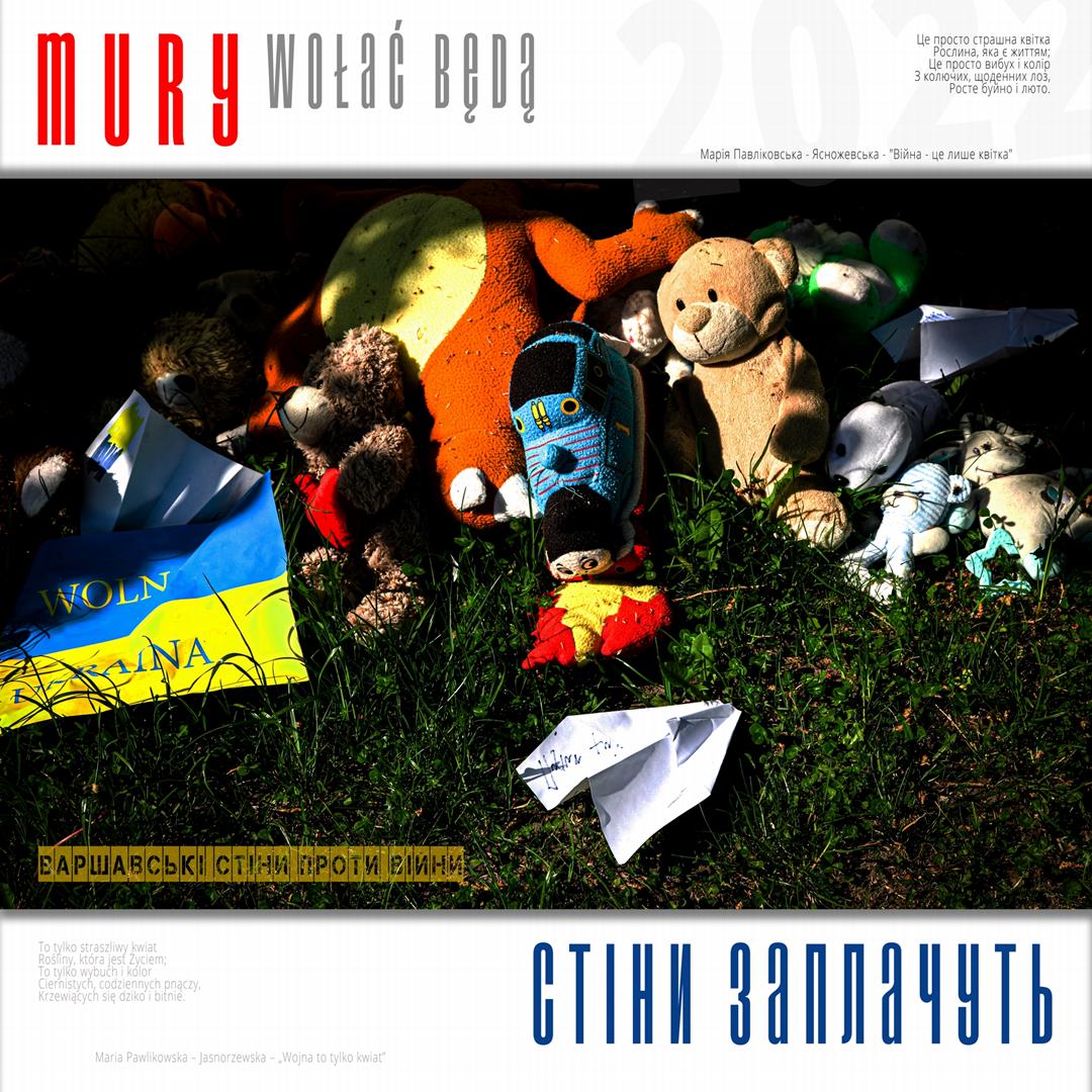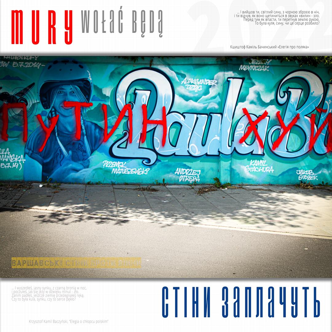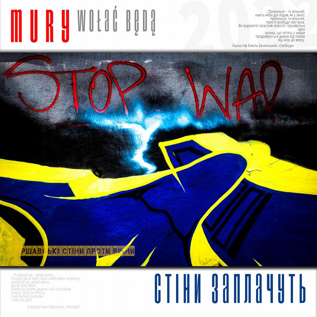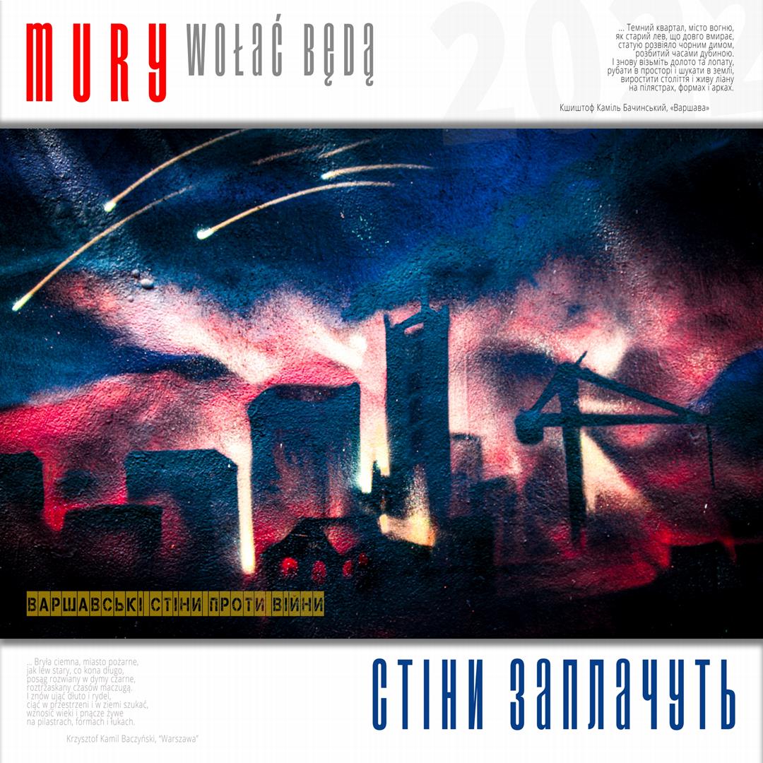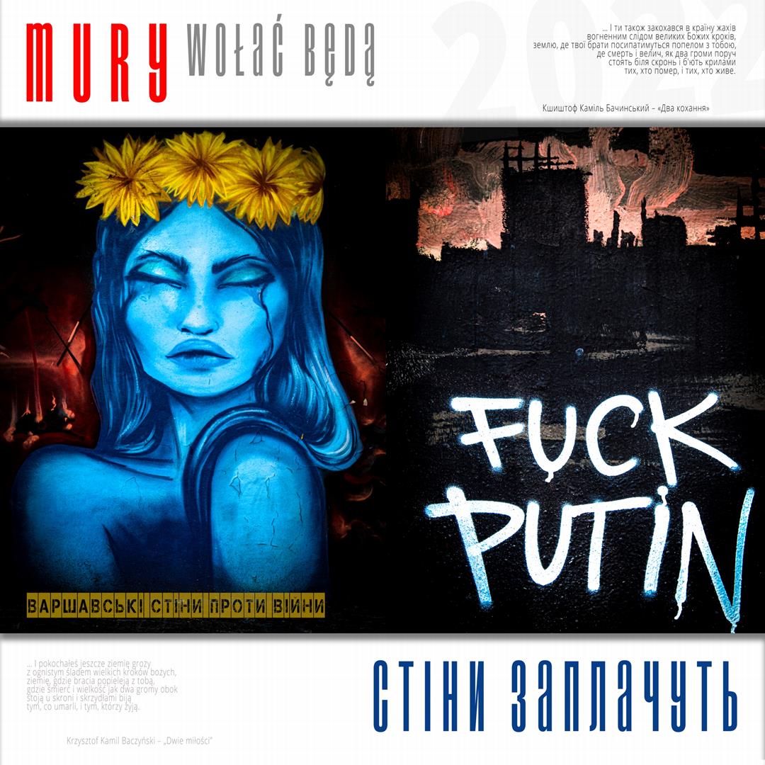 Warto naszym zdaniem zaznaczyć, iż zdaniem realizatorów projektu istnieje w jego treści bezpośrednie nawiązanie do wydarzeń znanych z historii Polski, w szczególności zaś do historii naszego miasta w okresie okupacji niemieckiej. Ukraińskie miasta w czasie walki z rosyjskim najeźdźcą przypominają do złudzenia Warszawę lat czterdziestych – niezłomną, szydzącą z wroga, przeciwstawiającą brutalnej sile uliczną kpinę i absolutnie nieprzyjmującą do wiadomości żądań poddania się nieprzyjacielowi, drwiącą z niego napisami na murach i twórczością ulicznych artystów. Warszawa reagowała wówczas na działania niemieckich okupantów kotwicami na murach, hasłami i „zakazanymi piosenkami”, które w warszawskiej tradycji przetrwały do lat obecnych. Uważamy, iż ukazanie współczesnych warszawskich ulicznych grafik, haseł i niejednokrotnie dzieł o wysokiej wartości artystycznej w kontekście niezłomności współczesnych miast ukraińskich i oporu jego mieszkańców wobec działań wojennych i presji propagandy rosyjskiej (ale także w kontekście historii naszego miasta) może stanowić wartościowy element naszego wkładu w walkę Ukrainy o przetrwanie i zwycięstwo. Udokumentowanie masowego poparcia warszawiaków dla krzywdy naszych sąsiadów. Stąd właśnie wszystkie fotografie, jakie zamieściliśmy na naszej wystawie opatrzone są fragmentami polskiej poezji wojennej z lat 1939 – 1945, w tym w szczególności fragmentami wierszy opisujących wojenną codzienność Warszawy – poezji Krzysztofa Kamila Baczyńskiego, Tadeusza Gajcego, Władysława Broniewskiego, Marii Pawlikowskiej – Jasnorzewskiej, Juliusza Krzyżewskiego, Józefa Szczepańskiego, Jana Brzechwy, Wiktora Hulewicza i innych autorów opisujących Warszawę lat wojny i oporu. Wszystkie fragmenty wierszy zawartych w treści wystawy przetłumaczone zostały również na język ukraiński.
