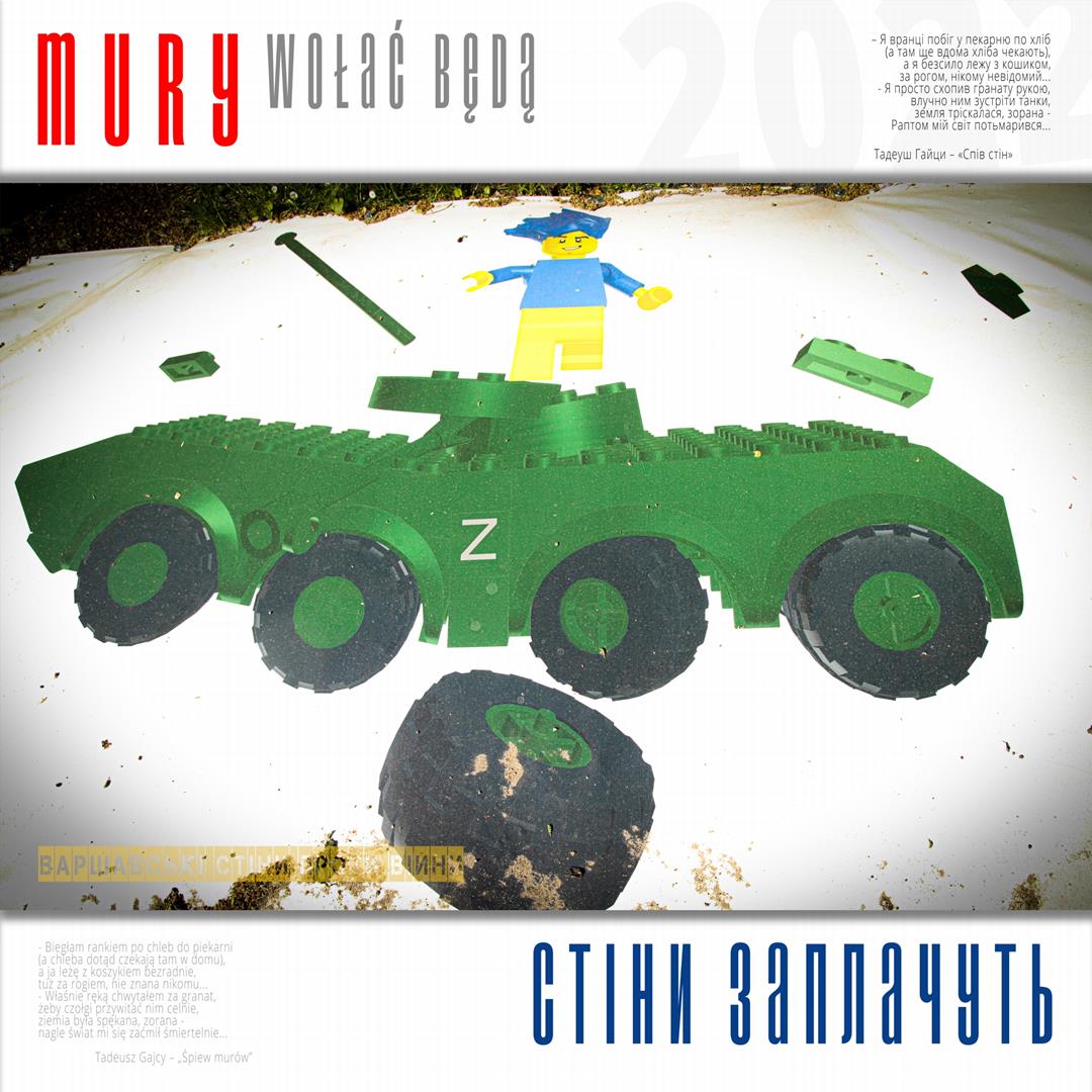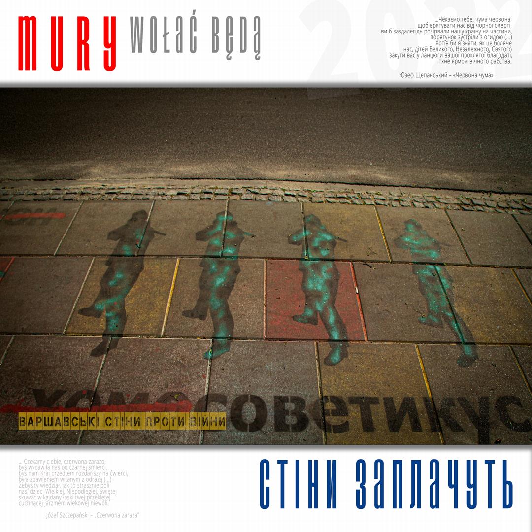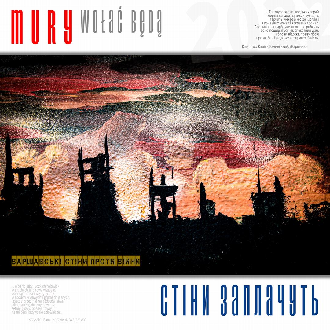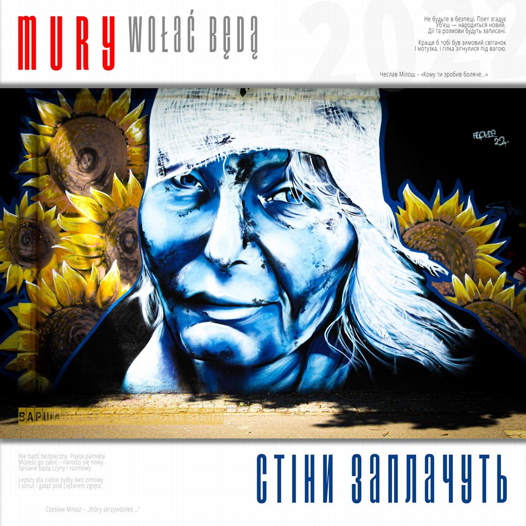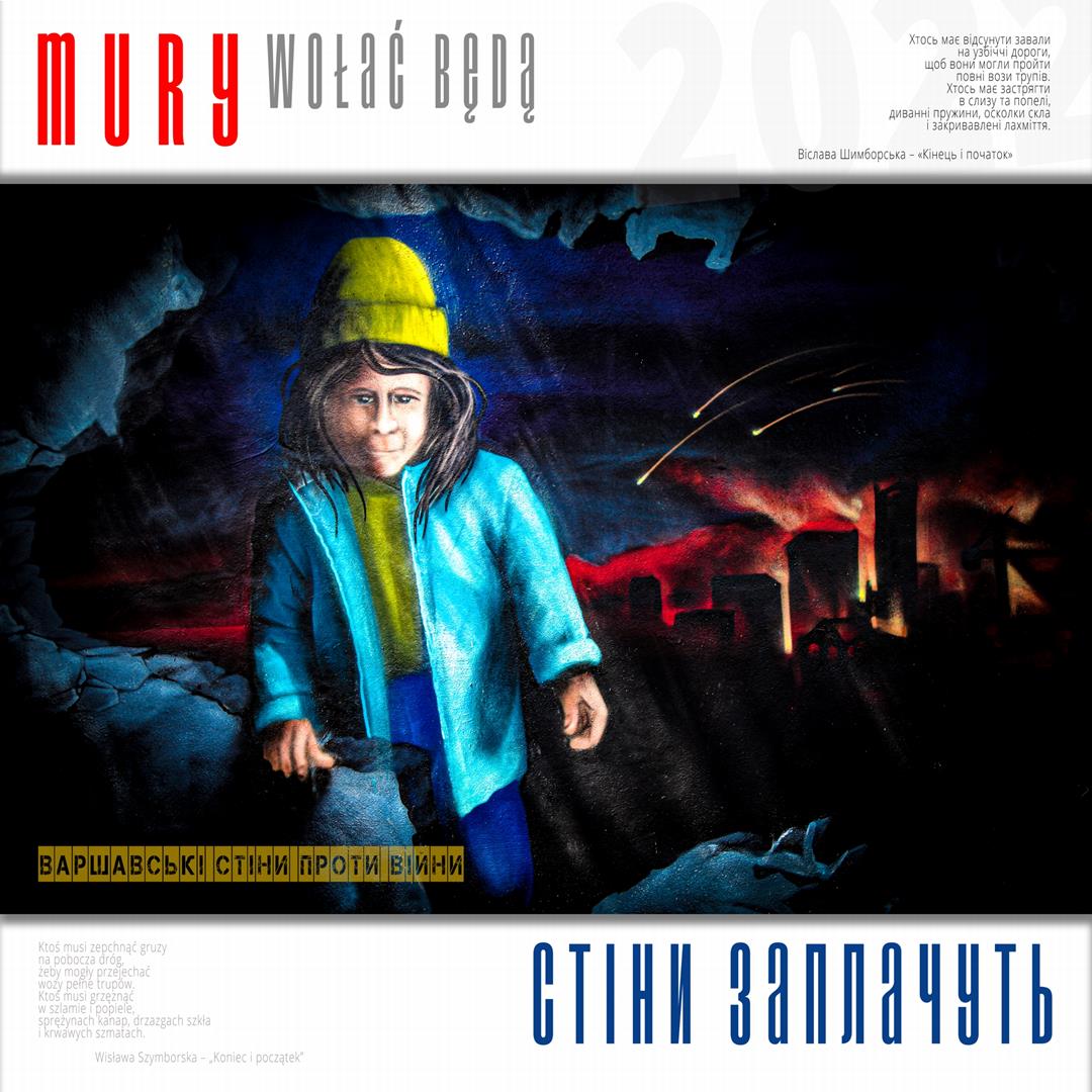 Warto naszym zdaniem zaznaczyć, iż zdaniem realizatorów projektu istnieje w jego treści bezpośrednie nawiązanie do wydarzeń znanych z historii Polski, w szczególności zaś do historii naszego miasta w okresie okupacji niemieckiej. Ukraińskie miasta w czasie walki z rosyjskim najeźdźcą przypominają do złudzenia Warszawę lat czterdziestych – niezłomną, szydzącą z wroga, przeciwstawiającą brutalnej sile uliczną kpinę i absolutnie nieprzyjmującą do wiadomości żądań poddania się nieprzyjacielowi, drwiącą z niego napisami na murach i twórczością ulicznych artystów. Warszawa reagowała wówczas na działania niemieckich okupantów kotwicami na murach, hasłami i „zakazanymi piosenkami”, które w warszawskiej tradycji przetrwały do lat obecnych. Uważamy, iż ukazanie współczesnych warszawskich ulicznych grafik, haseł i niejednokrotnie dzieł o wysokiej wartości artystycznej w kontekście niezłomności współczesnych miast ukraińskich i oporu jego mieszkańców wobec działań wojennych i presji propagandy rosyjskiej (ale także w kontekście historii naszego miasta) może stanowić wartościowy element naszego wkładu w walkę Ukrainy o przetrwanie i zwycięstwo. Udokumentowanie masowego poparcia warszawiaków dla krzywdy naszych sąsiadów. Stąd właśnie wszystkie fotografie, jakie zamieściliśmy na naszej wystawie opatrzone są fragmentami polskiej poezji wojennej z lat 1939 – 1945, w tym w szczególności fragmentami wierszy opisujących wojenną codzienność Warszawy – poezji Krzysztofa Kamila Baczyńskiego, Tadeusza Gajcego, Władysława Broniewskiego, Marii Pawlikowskiej – Jasnorzewskiej, Juliusza Krzyżewskiego, Józefa Szczepańskiego, Jana Brzechwy, Wiktora Hulewicza i innych autorów opisujących Warszawę lat wojny i oporu. Wszystkie fragmenty wierszy zawartych w treści wystawy przetłumaczone zostały również na język ukraiński.